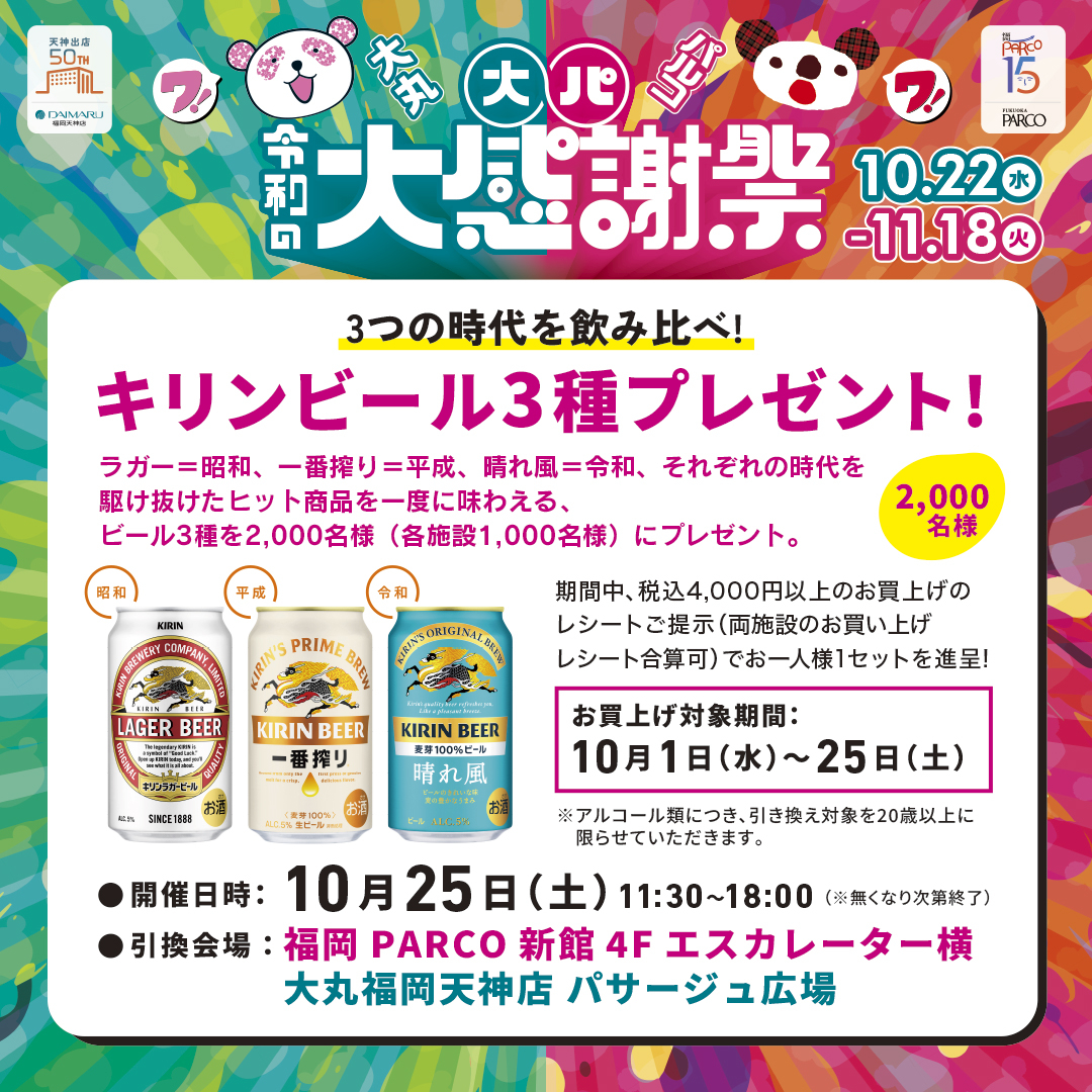 昭和・平成・令和の3年号を紡ぎ、その時代の嗜好に応じてブラッシュアップさせ、よりおいしい味わいを追求するキリンビールのスタンダードビールとタイアップを図り、「キリンラガービール」(昭和 63 年発売)、「キリン一番搾り生ビール」(平成 2 年発売)、「キリンビール 晴れ風」(令和 6 年発売)の【キリンビール3種を1セットに計 2,000 名様(各施設1,000 名様)に謝恩プレゼント】いたします。
