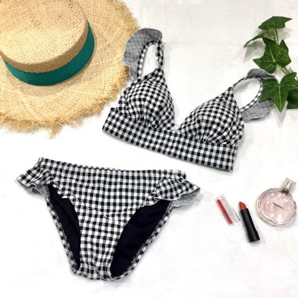 旬な柄ギンガムチェックとフリルがガーリーなショルダー三角ビキニ。