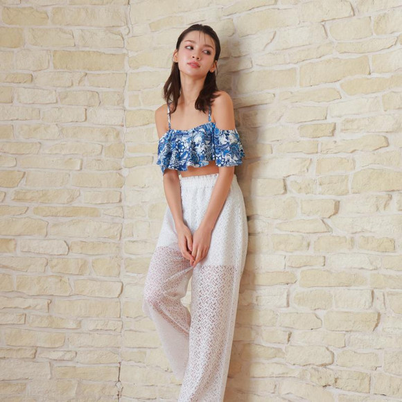 レース系のアイテムやデニムなどの無地アイテムと合わせると、柄物水着初心者さんでも挑戦しやすくなります☆