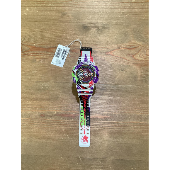 エヴァンゲリオン初号機をモチーフとした、ホワイトベースにパープルやグリーンのカラーリングが圧巻!ベゼルには初号機の顔、バンドにはロンギヌスの槍を握りしめた左腕など、細部にわたるこだわりがG-SHOCKの技術力をもって再現されています。