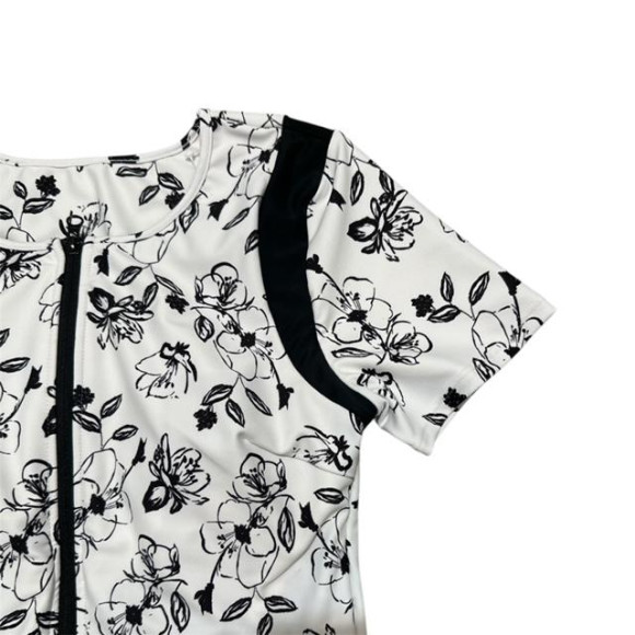 半袖のフィットネス水着は、二の腕をカバーし肩の無地切り替えもすっきりとアクセントになります◎