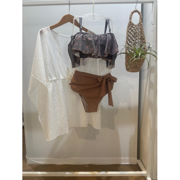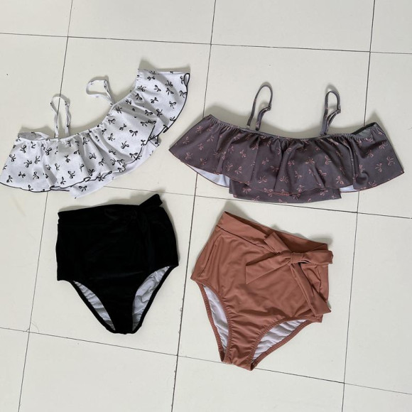 可愛いらしさ全開のオフショルダー水着には、ハイウエストショーツの左側に結べるリボンをプラス!