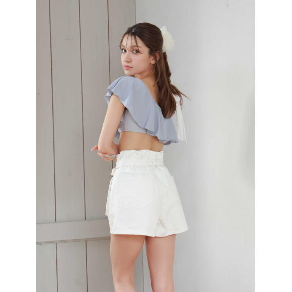 無地レース素材ショートパンツと合わせたフェミニンコーデや、リボンハイウエストデニムショートパンツと合わせたカジュアルなコーディネートがおすすめ!