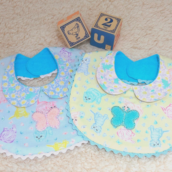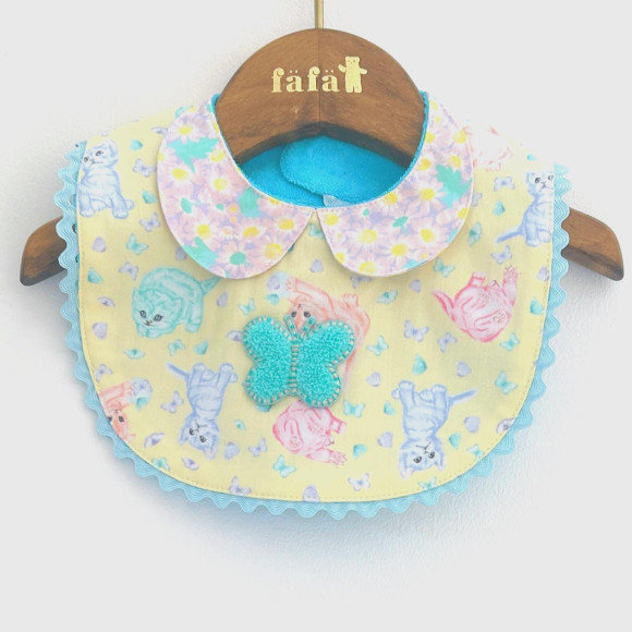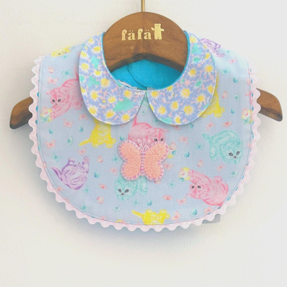 カラフルなネコちゃん柄に真ん中にはもこもこバタフライのアップリケ♡