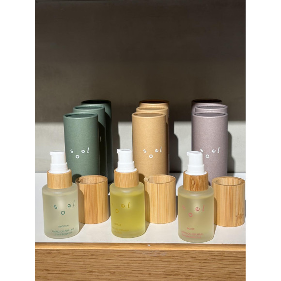 soel別注のヘアオイルは、とろみのあるリッチなテクスチャーで毛先まで深く潤いを与えてくれます。