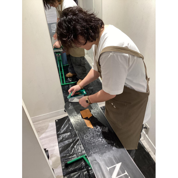 写真をご覧ください。スタッフが専用のアイロンを使い、ソール(板の裏面)にじっくりとワックスを浸透させています。