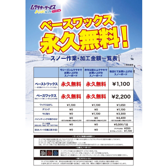 ムラサキスポーツでスノーボードをご購入いただくと、そのボードが寿命を迎えるまで、**ベースワックス施工を何度でも「無料」**で承ります。