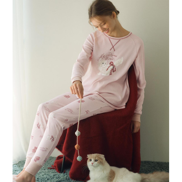 ベースはくすんだピンク。トップスはグレー系の子猫と「My curious World」の文字のワンポイント、ボトムスはホリデイ小物と子猫、文字を全体にプリント。