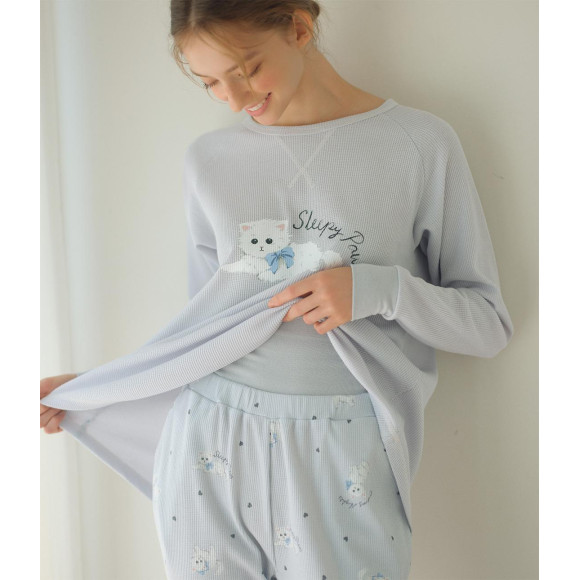 ベースはくすんだブルーグレー。トップスは白い子猫と「Sleepy Paws」の文字のワンポイント、ボトムスは小粒ハートと子猫、文字を全体にプリント。