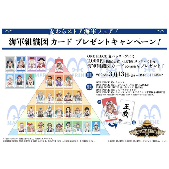 麦わらストアにて商品を2,000円(税込)購入するごとにランダムで1枚、海軍組織図カード(全32種)をプレゼント!