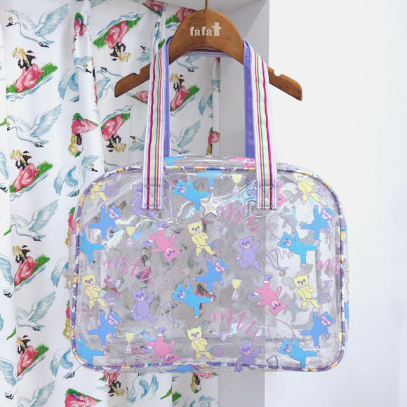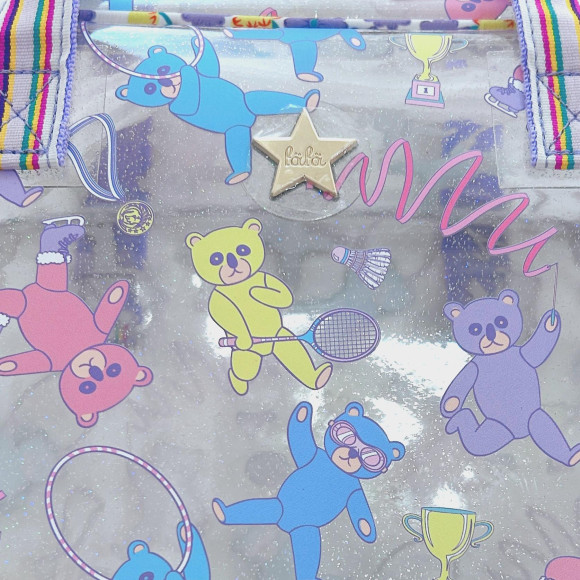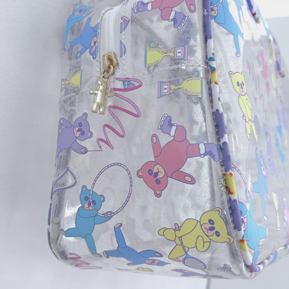 キラキララメのPVC素材にカラフルくまさんがプリントされたボストンタイプのプールバッグ