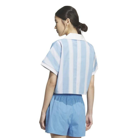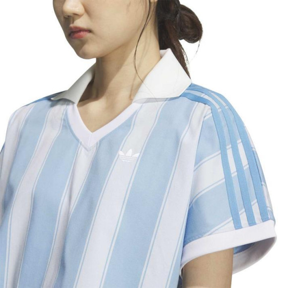 大胆なVネックカラーと同系色のスリーストライプスが肩を彩り
