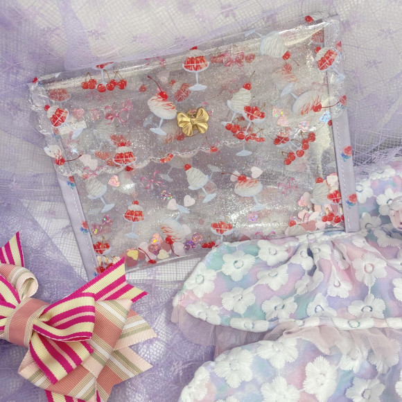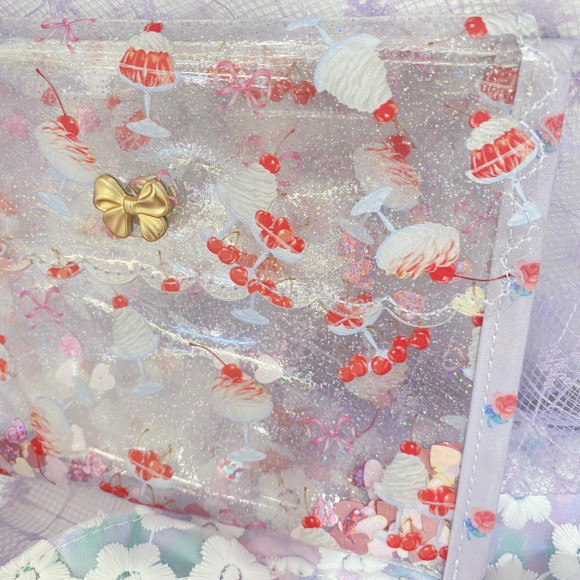 クリアラメに赤が映えるデザート柄が
